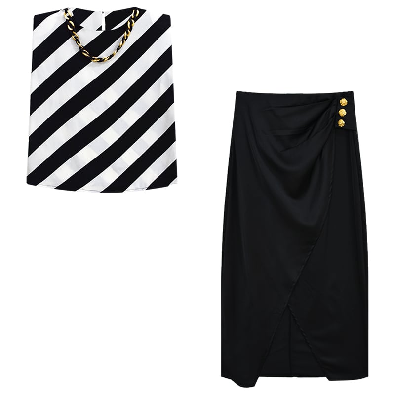 セットアップ OL/通勤 ノースリーブ 白黒ストライプ柄 トップス+スカート ブラック S M L