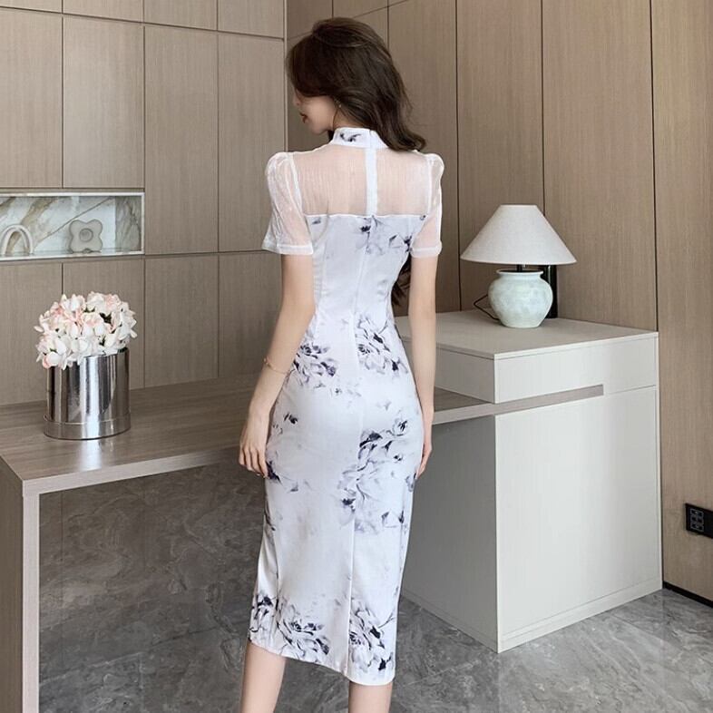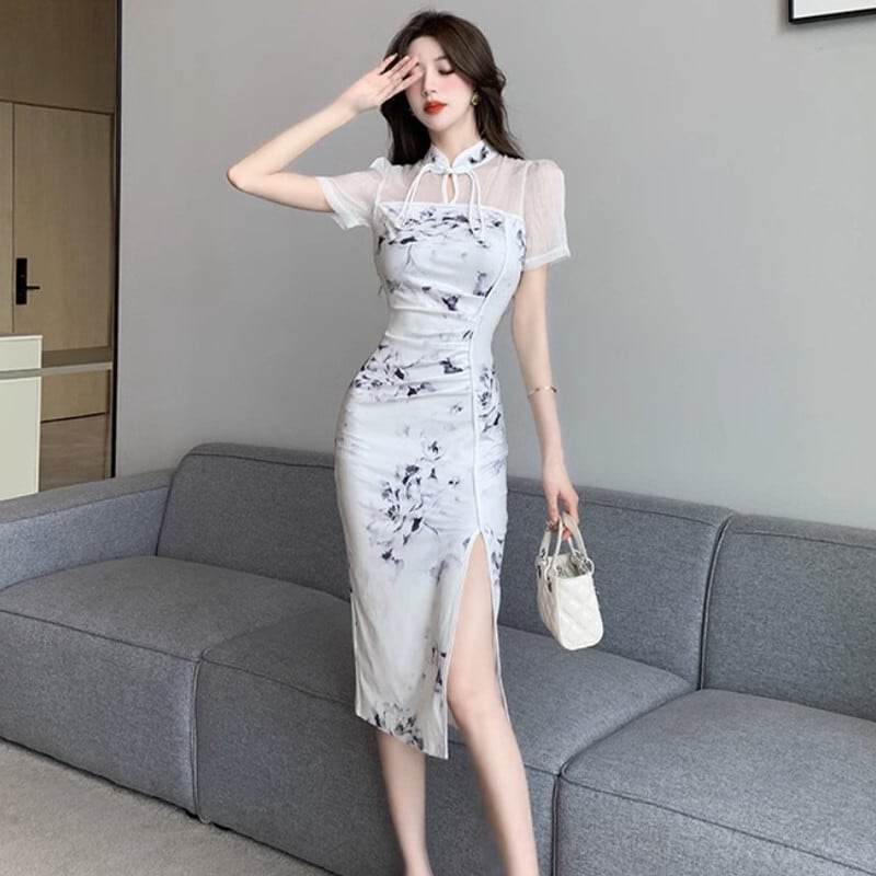 【CHERRYシリーズ】チャイナ風ワンピース メッシュ プリント おしゃれ S M L