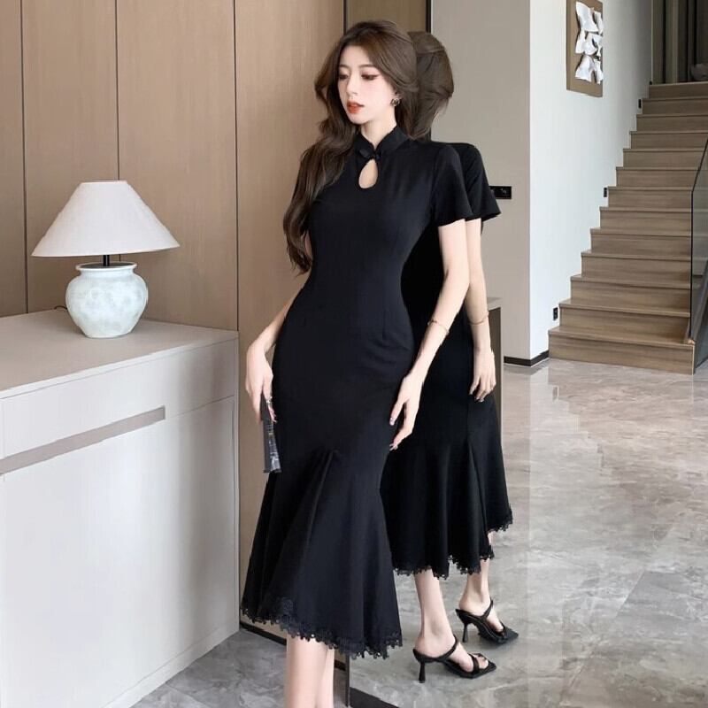 【CHERRYシリーズ】チャイナ風ワンピース 無地 黒 フィッシュテール ブラック S M L