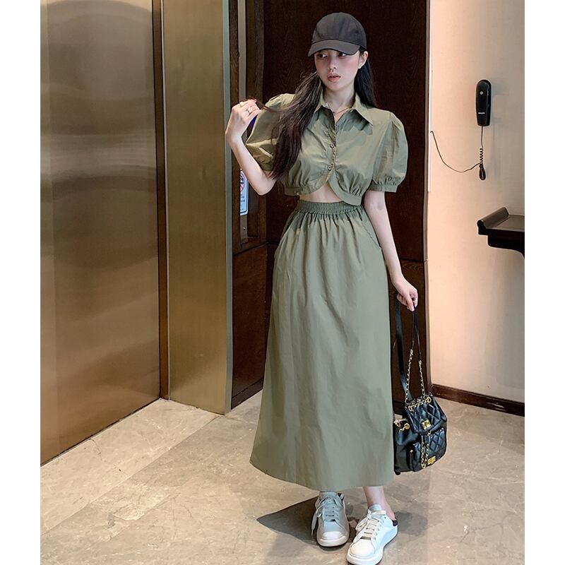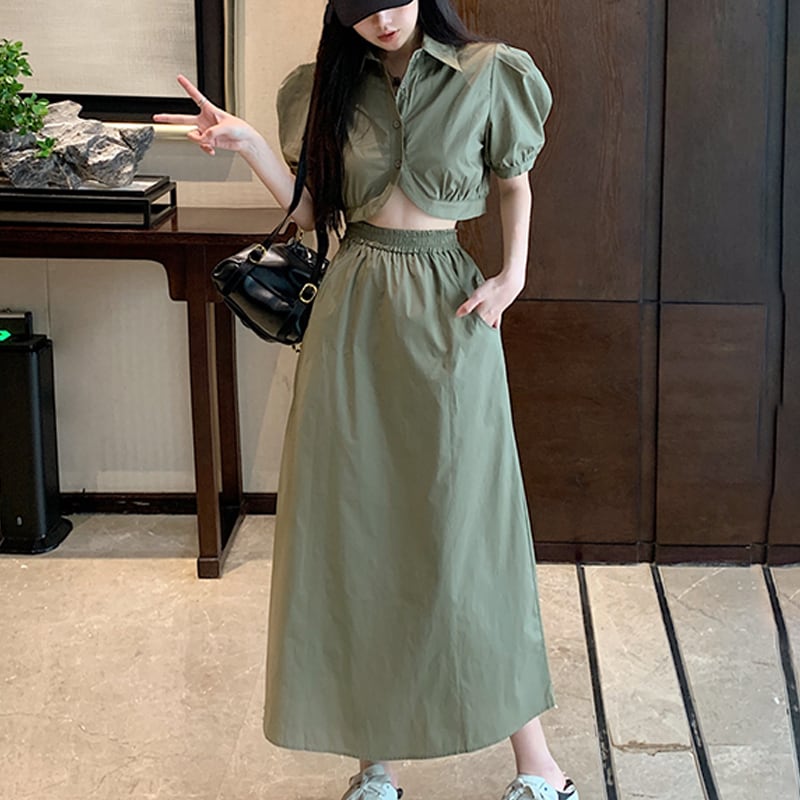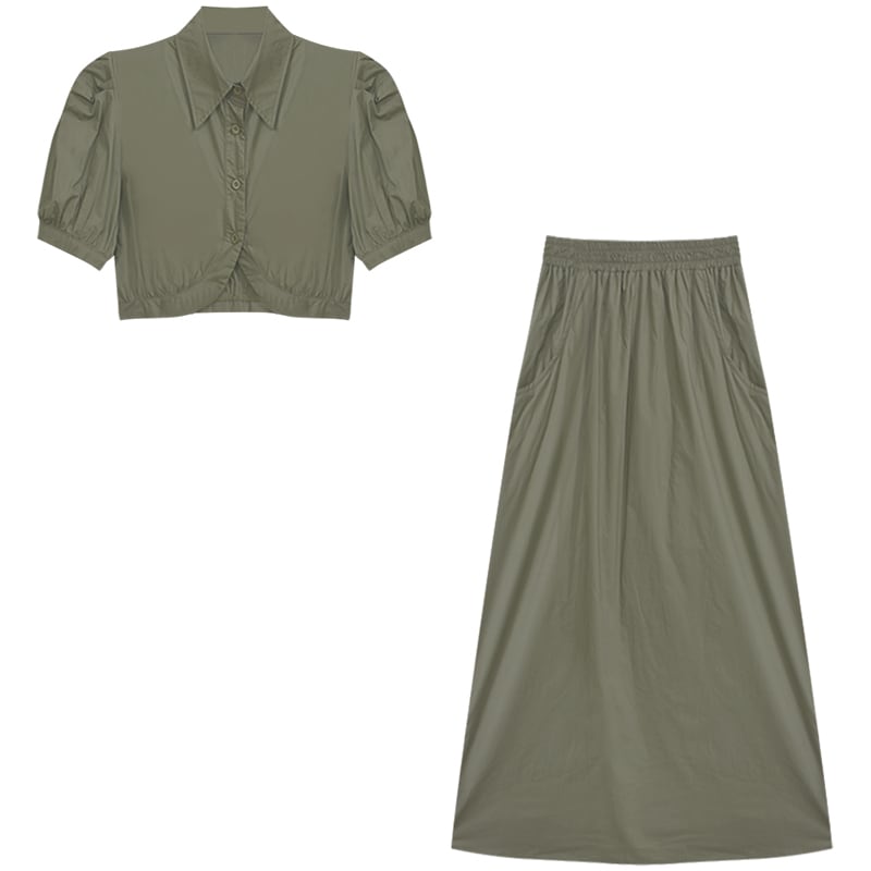 セットアップ OL/通勤 気質UP 無地 長袖 トップス+スカート ダークグリーン ブラック