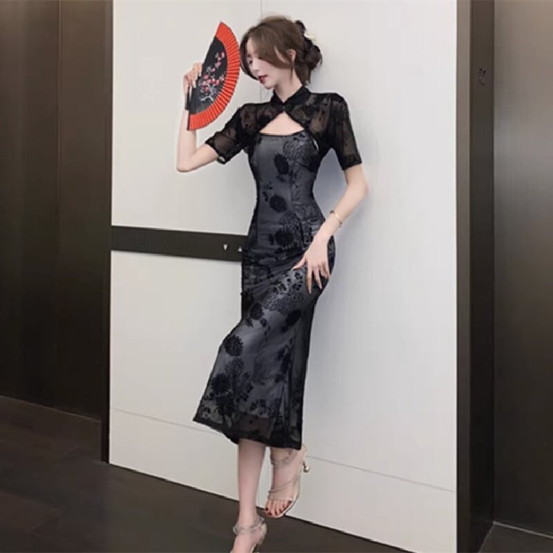 【CHERRYシリーズ】チャイナ風ワンピース ストール付き レース ブラック S M L
