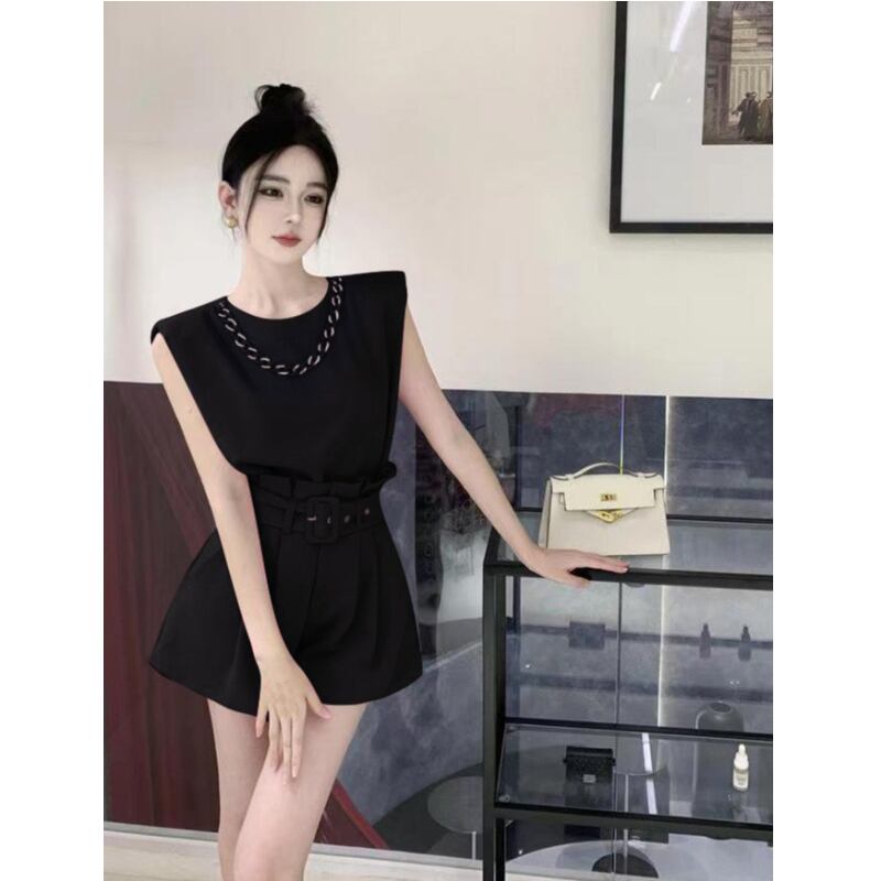セットアップ ノースリーブ 無地 チェーン トップス+パンツ ピンク ブラック S M L