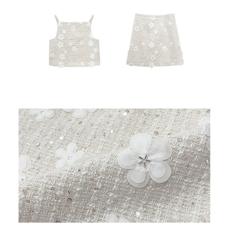 【Airi Styleシリーズ】セットアップ ツイード 3Dフラワー アームホール トップス+スカート ベージュ S M L