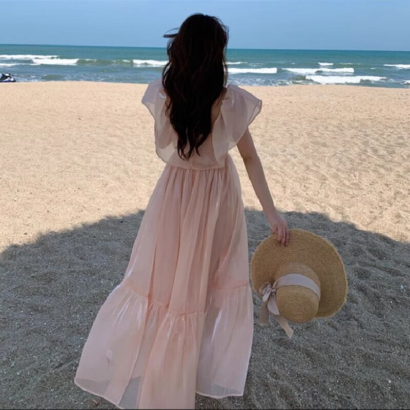 【SummerVacationシリーズ】ワンピース ボートネックデザイン 大振裾 撮影着 ライトピンク S M L
