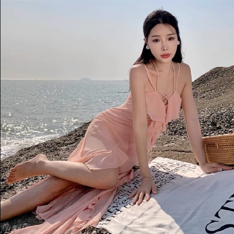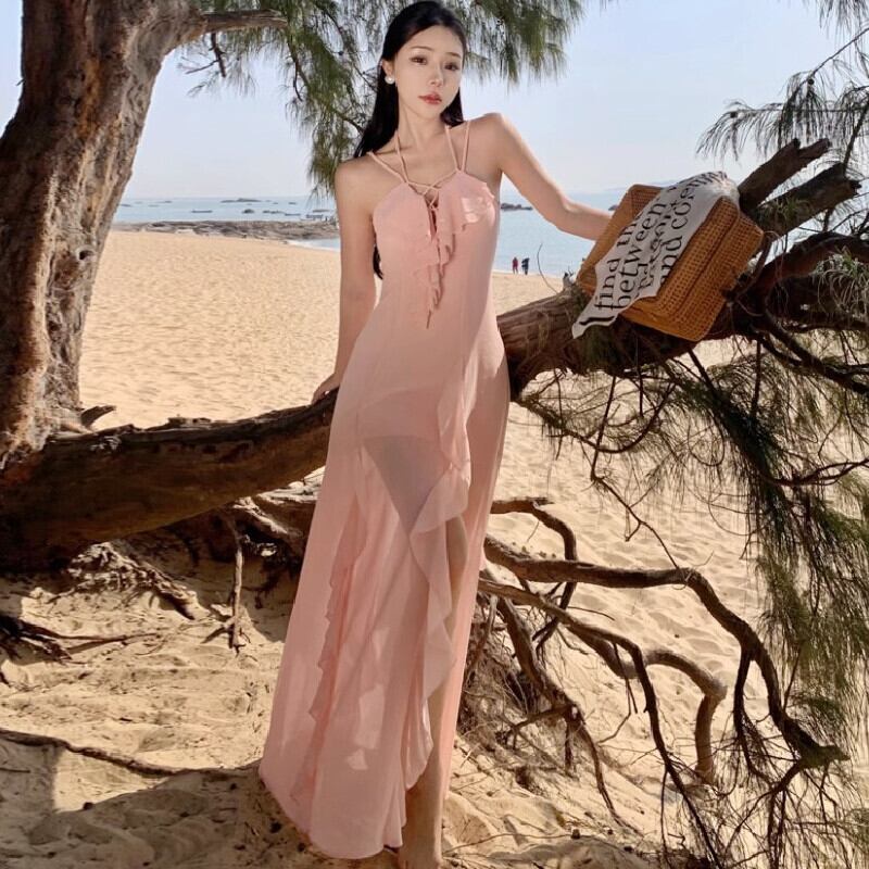 【SummerVacationシリーズ】吊りワンピース ペプラム スリット 女性らしい ライトピンク S M L XL