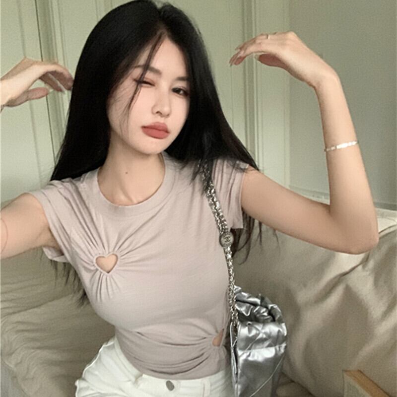 トップス Tシャツ 透かし彫り 半袖 ラウンドネック ブラック ホワイト カーキ色
