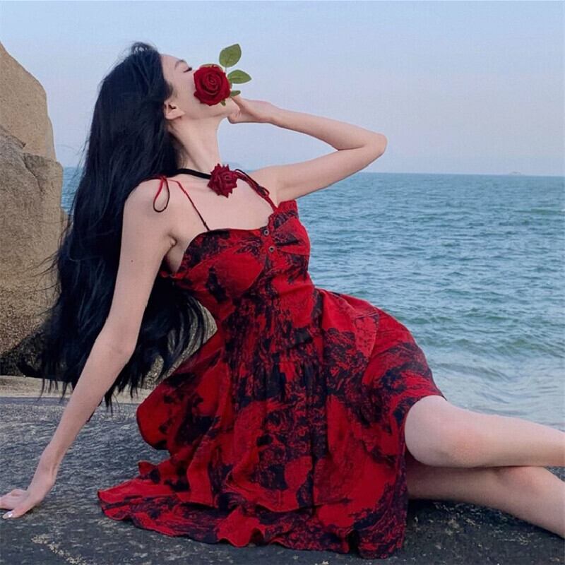 【SummerVacationシリーズ】吊りワンピース 目を奪われる 花柄 Aライン 配色 S M L