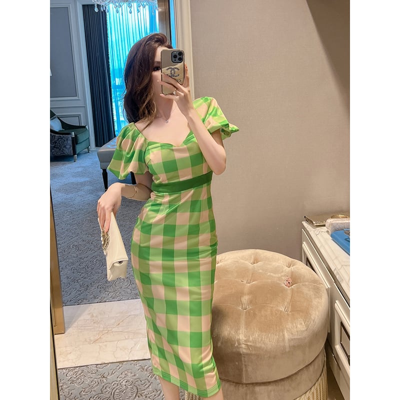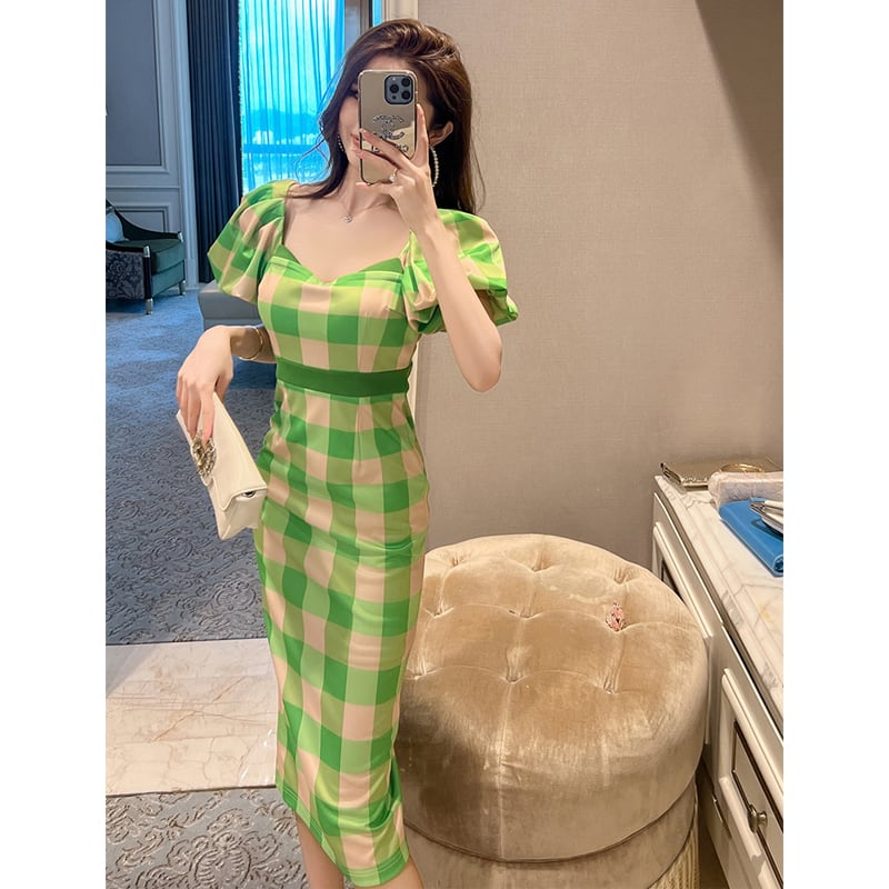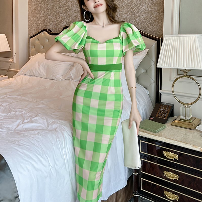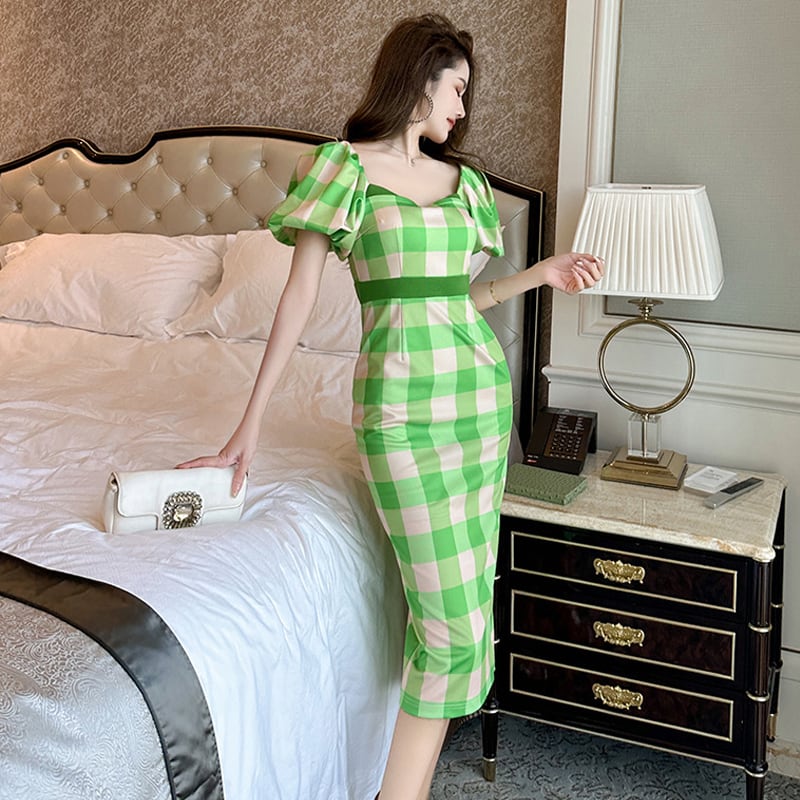 【夕暮薔薇シリーズ】ワンピース レトロ エレガント チェック柄 大きいサイズ ピンク グリーン S M L XL 2XL