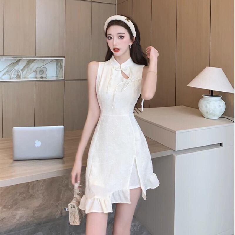 【CHERRYシリーズ】ワンピース チャイナ風 スウィート ノースリーブ ベージュ S M L XL