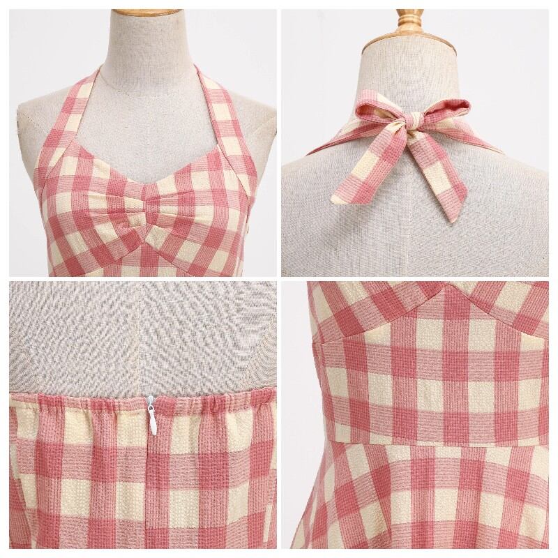 【BaBiシリーズ】ワンピース レトロ チェック柄 ロマンチック Aライン 大振裾 ホルターネック 大きいサイズ ピンク イエロー S M L XL 2XL