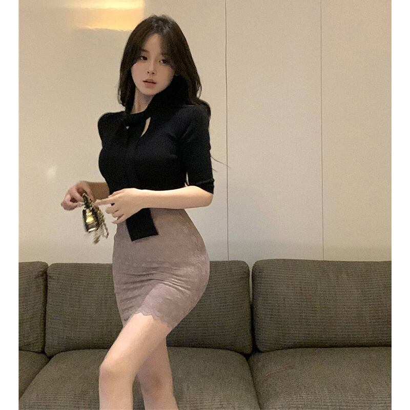 セットアップ セクシー 優しい オシャレ レース シャツ+スカート ブラック+コーヒー色