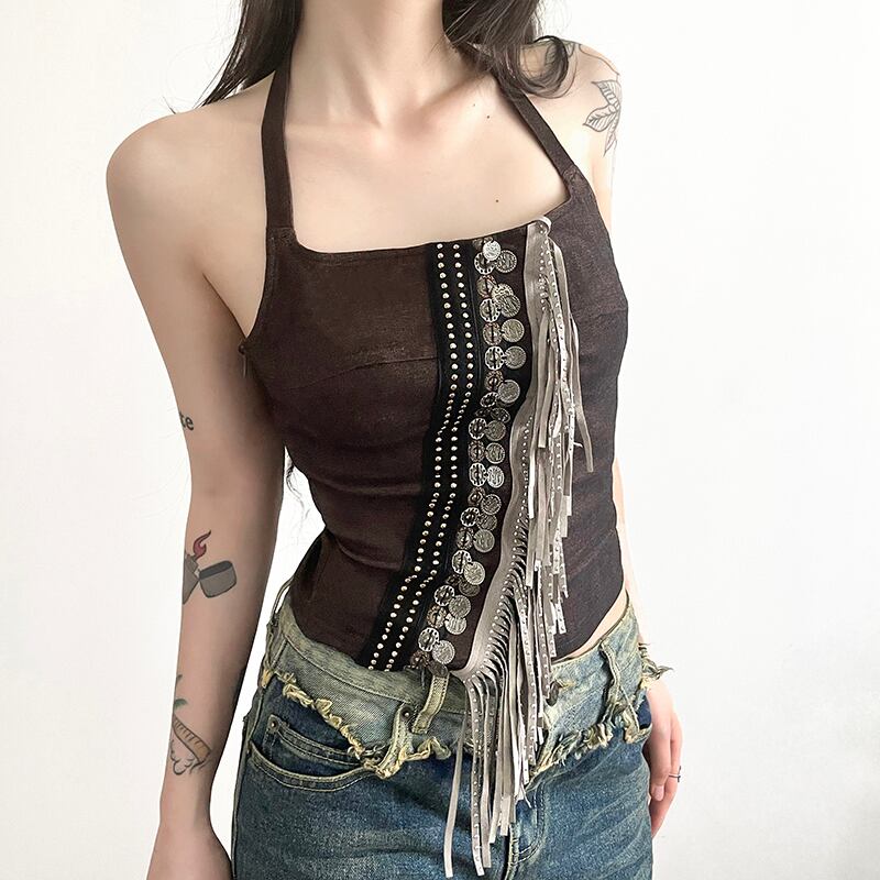 トップス キャミソール フリンジ セクシー 不規則 ブラウン S M L