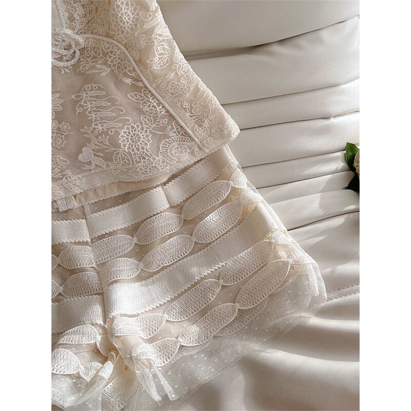 【Airi Styleシリーズ】セットアップ Vネック 高級感 パーティー レース 透かし彫り トップス+パンツ ベージュ S M L