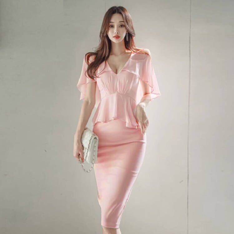 ワンピース フェミニン フェイクレイヤード ペプラム ピンク S M L XL