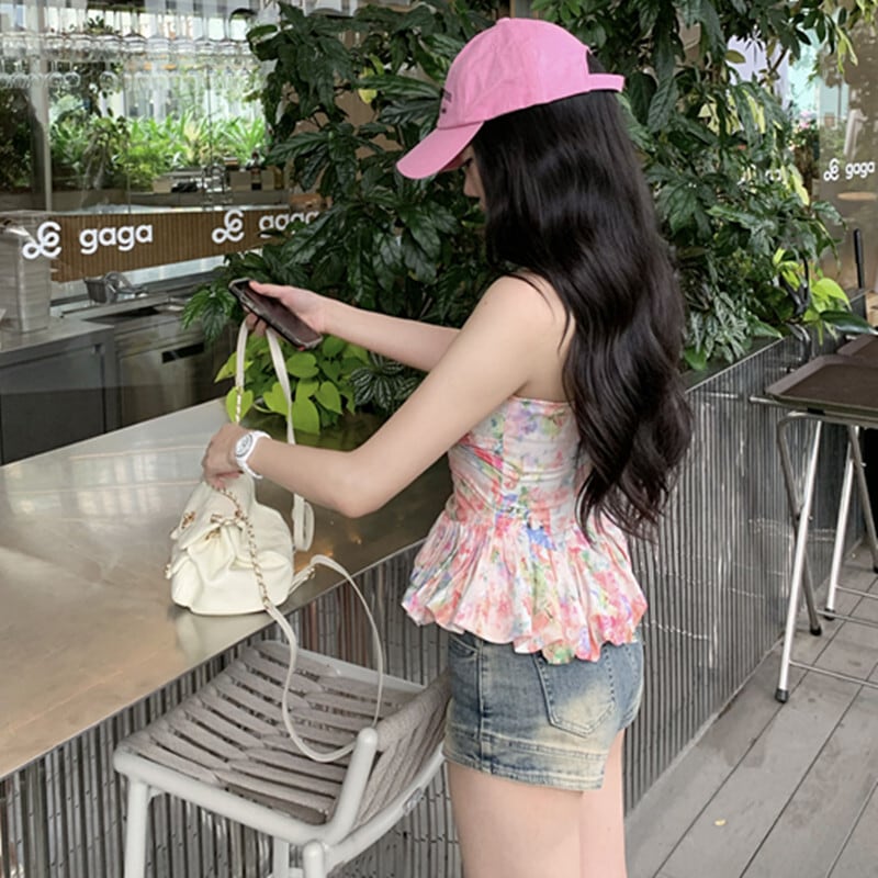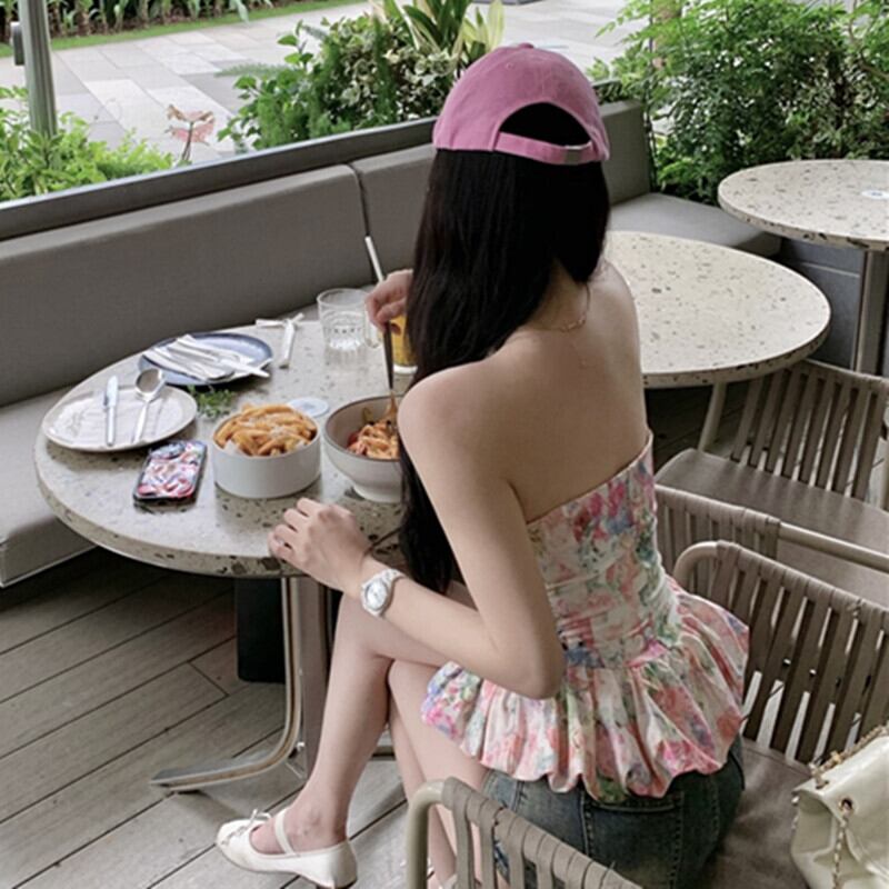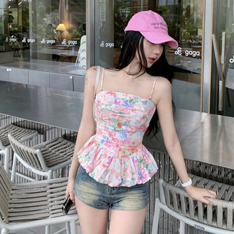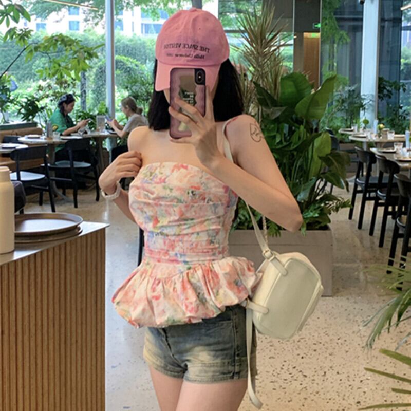 トップス キャミソール セクシー プリント 鎖骨見せ ペプラム S M