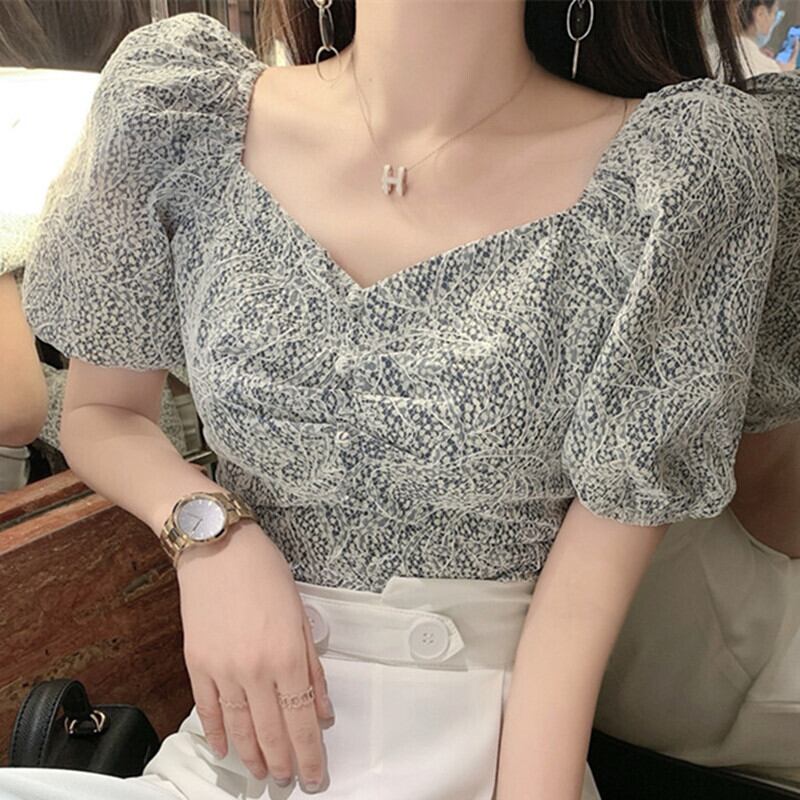 トップス シャツ 清新 プリント 半袖 パフスリーブ グレー S M