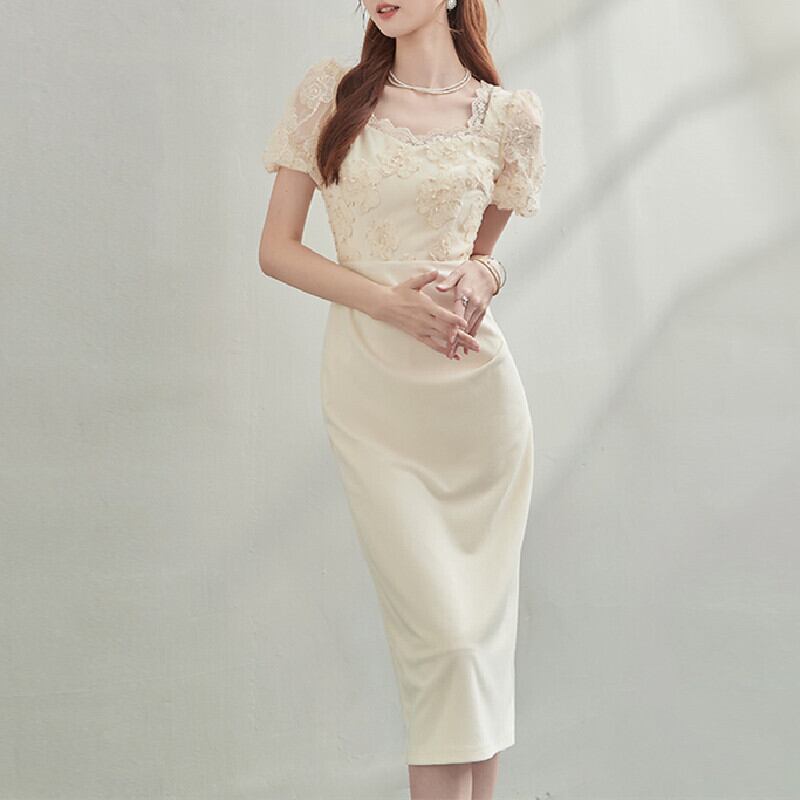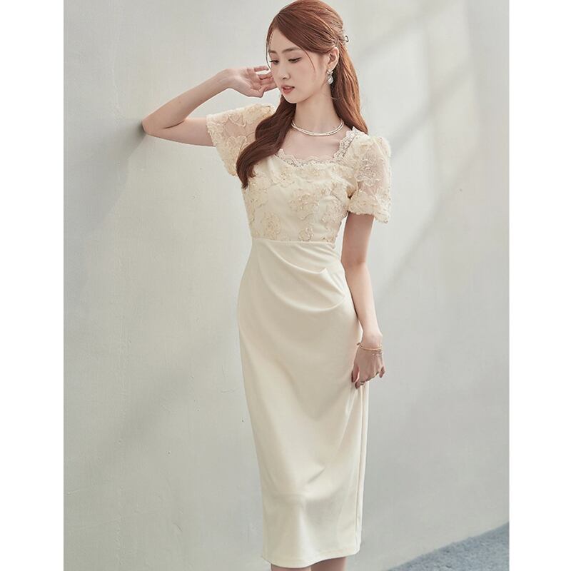 【Airi Styleシリーズ】ワンピース レース スクエアネック バックスリット ベージュ S M L