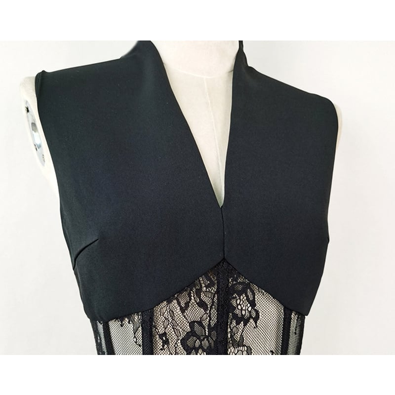 【Airi Styleシリーズ】ワンピース Vネック シボ裾 レース 透かし彫り パーティー ブラック S M L XL