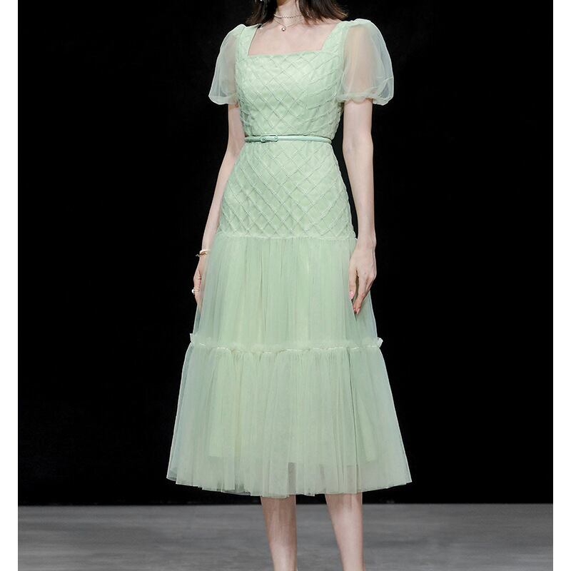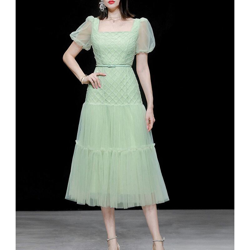 【ZiYanシリーズ】ワンピース ベルト付き スクエアネック ランタンスリーブ 切り替え グリーン S M L XL