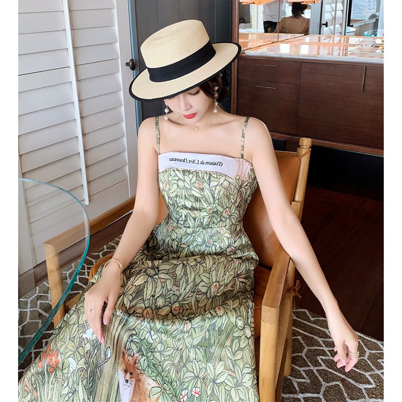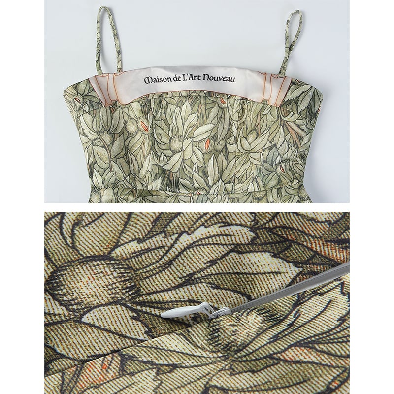 【Airi Styleシリーズ】吊りワンピース 高級感 Aライン 大振裾 パーティー プリント グリーン S M L