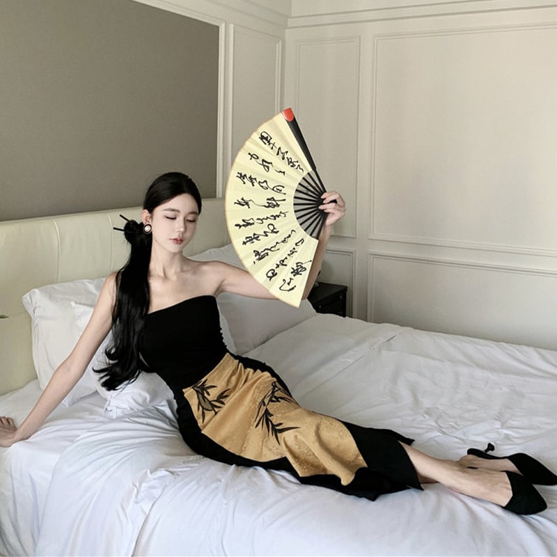 ワンピース チャイナ風 デザイン感 プリント チューブドレス ブラック S M L