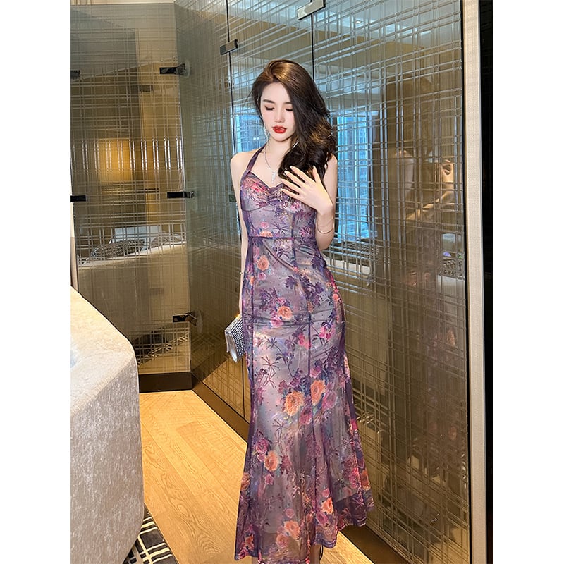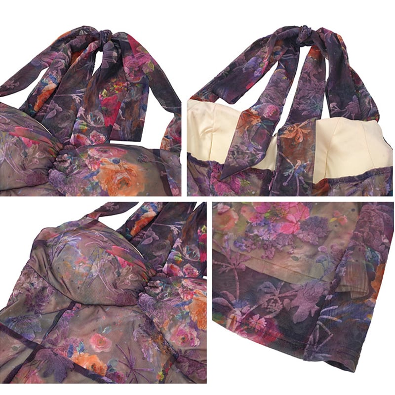 【夕暮薔薇シリーズ】ワンピース ホルターネック 不規則カラー デザイン感 フィッシュテール パープル S M L XL
