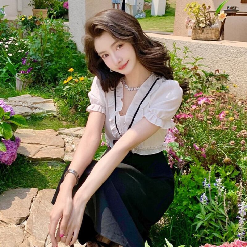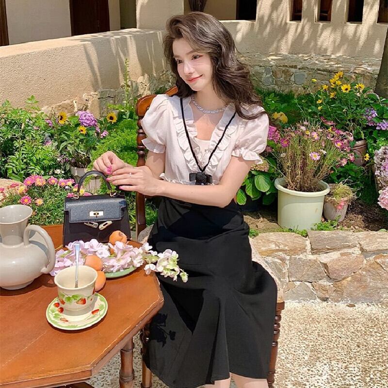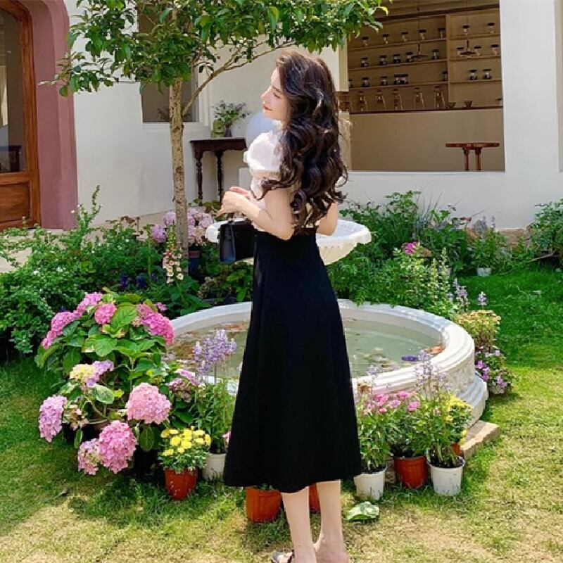 ワンピース パフスリーブ カジュアル ハイウエスト 配色 ベージュ+ブラック S M L XL