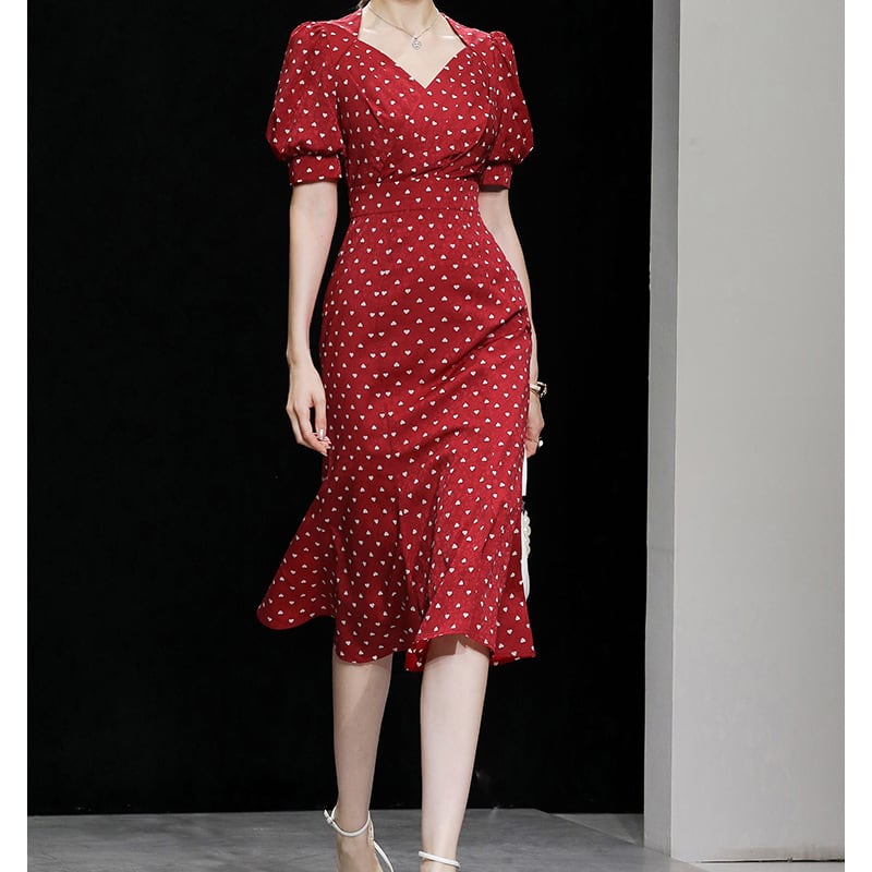 【ZiYanシリーズ】ワンピース 一目惚れ Vネック ランタンスリーブ 優しい ドット柄 レッド S M L XL
