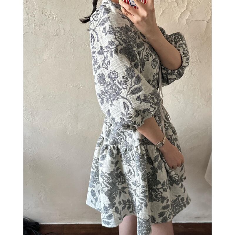 ワンピース デザイン感 かわいい ランタンスリーブ Vネック 花柄 ブラック ベージュ