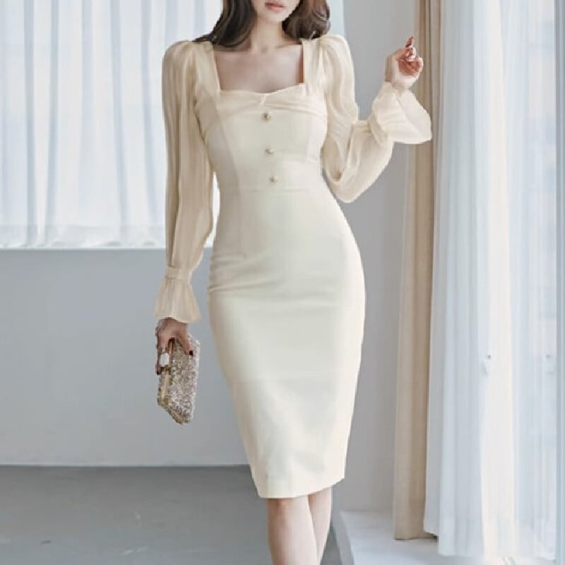 ワンピース スクエアネック エレガント 長袖 OL/フォーマル ライトイエロー S M L XL