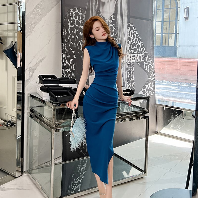 【夕暮薔薇シリーズ】ワンピース 気質UP セクシー ノースリーブ ハイネック 大きいサイズ ブルー ブラック S M L XL 2XL