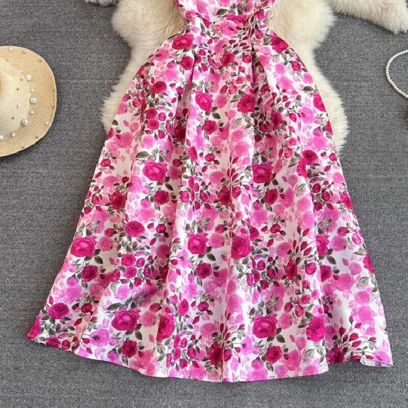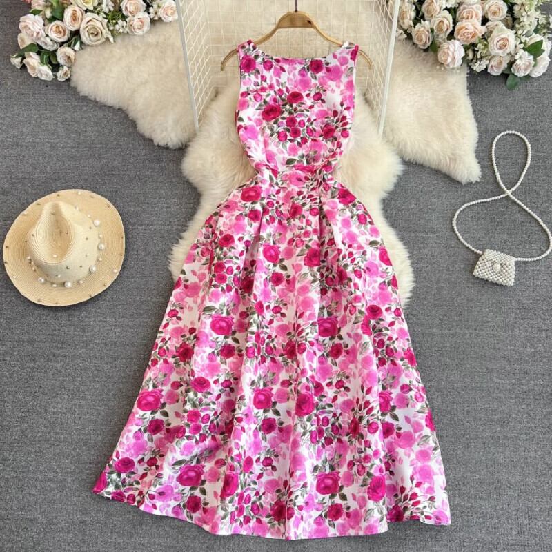 ワンピース ノースリーブ 花柄 ハイウエスト デート 大きいサイズ ローズ色 S M L XL 2XL