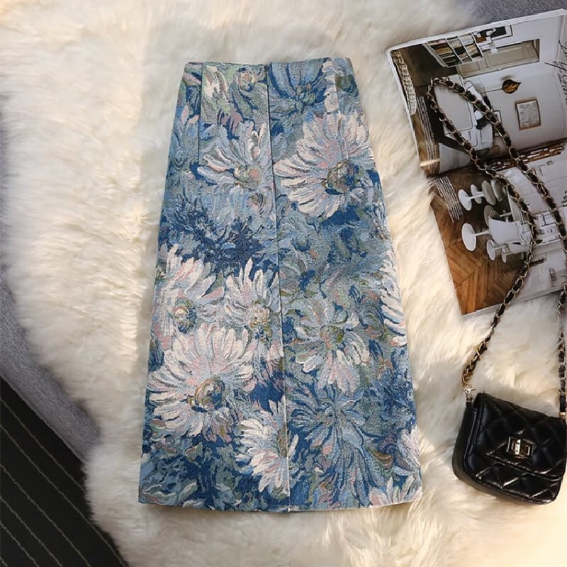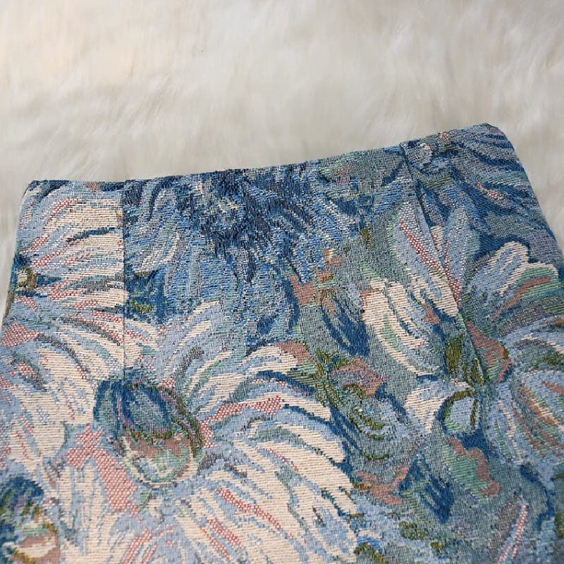 ボトムス スカート 長さ2パターン 花模様 油絵風 青い花柄 プリント S M L XL