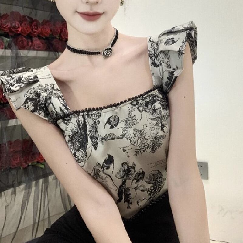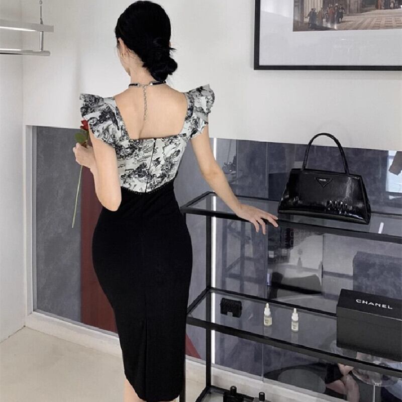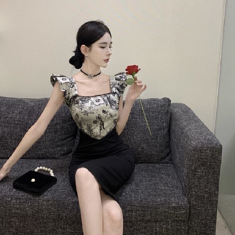 ワンピース ペプラム パーティー スクエアネック 花柄 着痩せ S M L XL