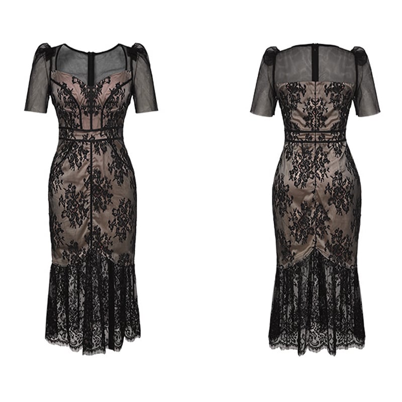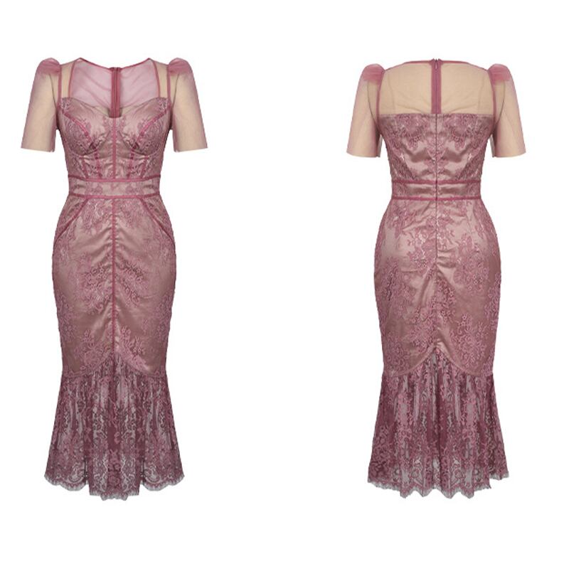 【夕暮薔薇シリーズ】ワンピース フィッシュテール スクエアネック セクシー パーティー レース ピンク ブラック S M L XL
