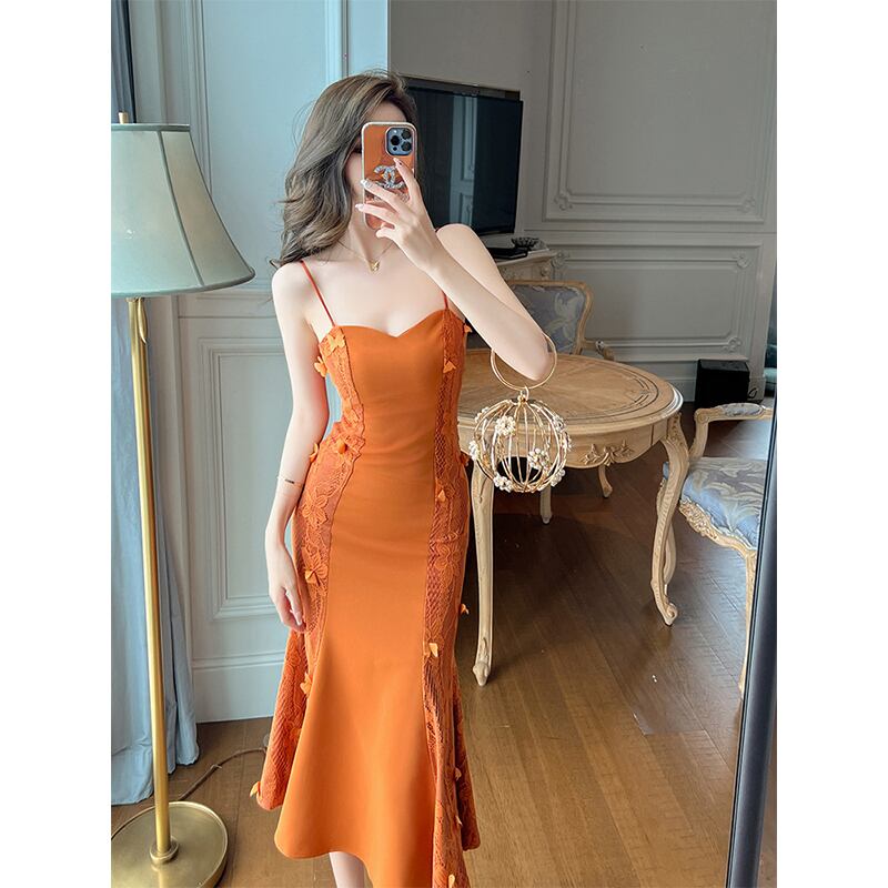 【夕暮薔薇シリーズ】吊りワンピースセクシー レース バタフライ フィッシュテール 透かし彫り オレンジ S M L XL