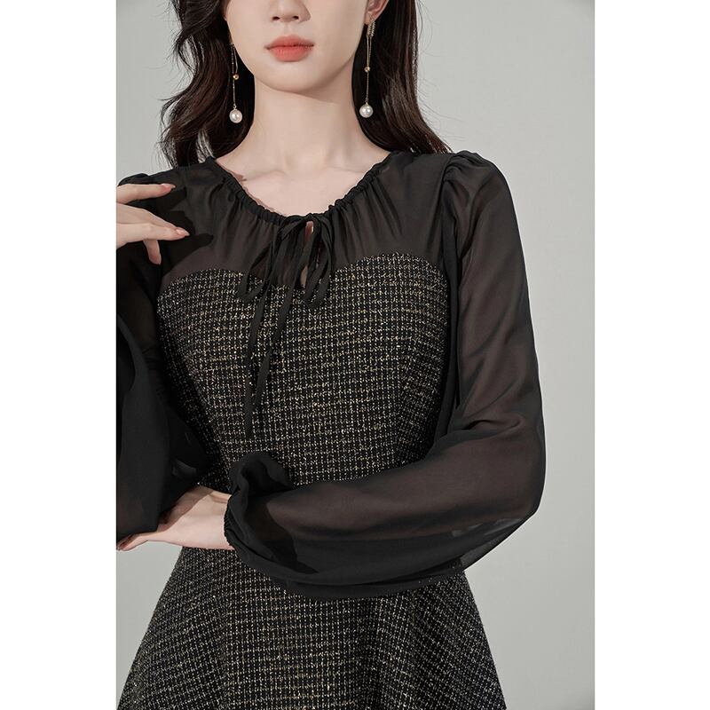 【Airi Styleシリーズ】ワンピース ツイード ハイウエスト 黒 ラウンドネック ブラック S M L