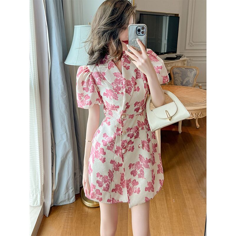 【夕暮薔薇シリーズ】ワンピース OL/通勤 気質UP 花柄 スーツ パフスリーブ Vネック ピンク S M L XL