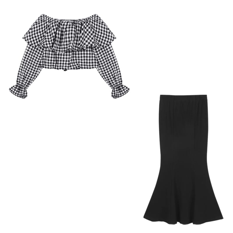 セットアップ OL/通勤 ボートネック チェック柄 フィッシュテール トップス+スカート ブラック