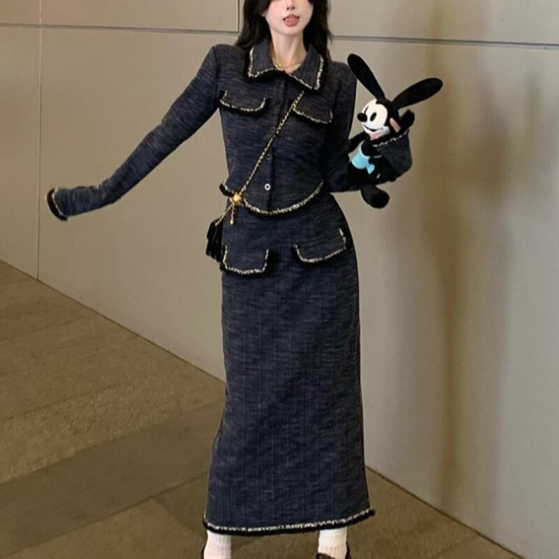 セットアップ 韓国系 ニット スピーカースリーブ トップス+スカート ネイビー S M L