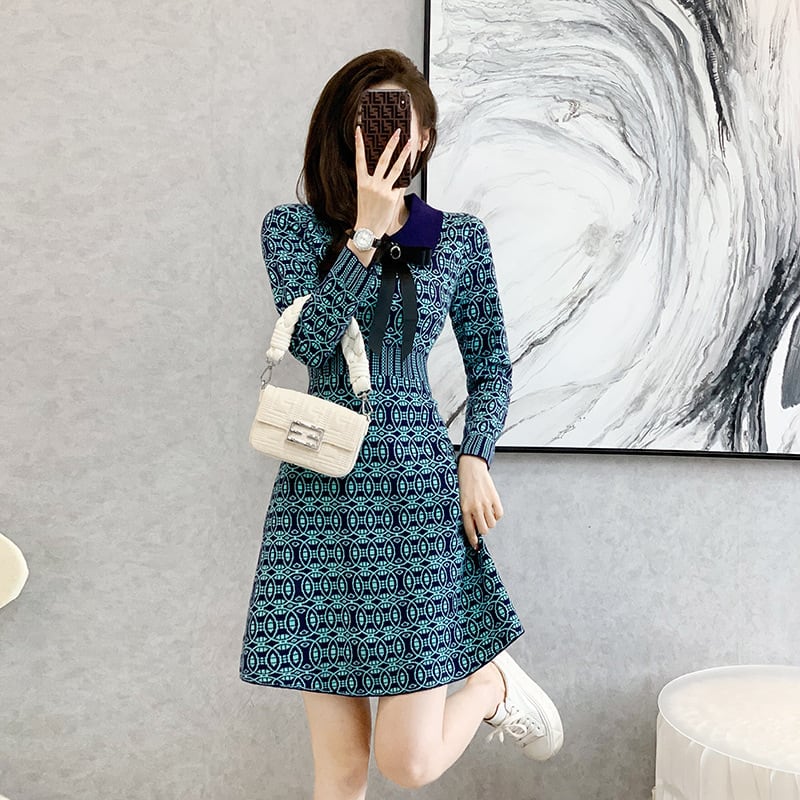 【森森家シリーズ】ワンピース ニット POLOネック 長袖 視線集中 ブルー S M L XL