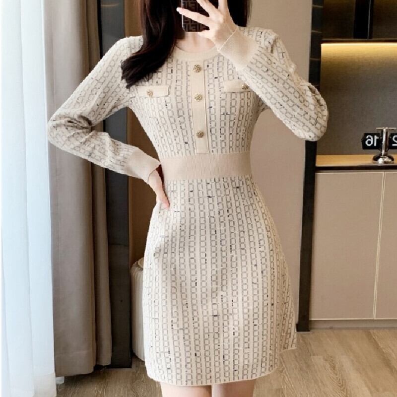 【森森家シリーズ】ワンピース ニット エレガント チェック柄 長袖 ラウンドネック ベージュ S M L XL