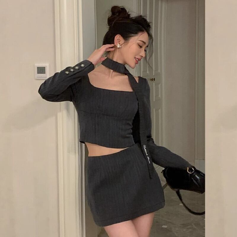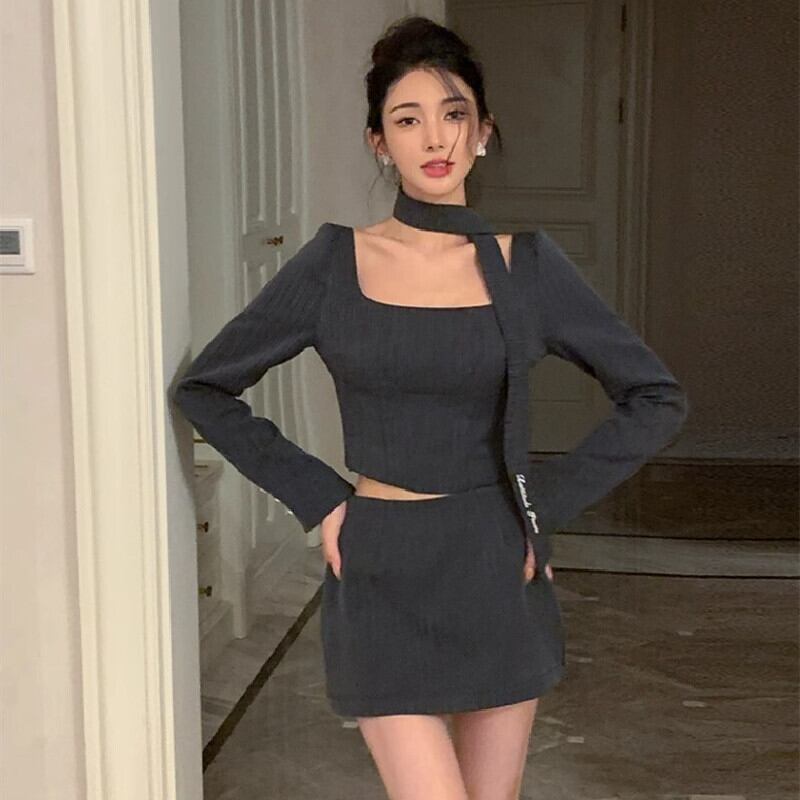 【ELEGANTSSシリーズ】セットアップ トップス+スカート スクエアネック 流行兆し グレー S M L XL