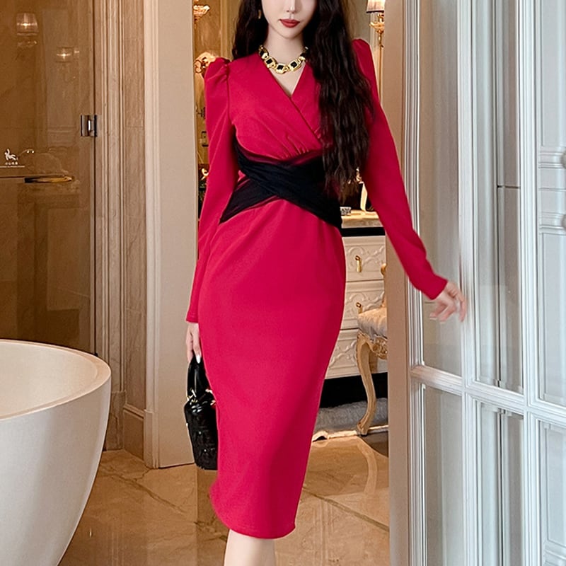 【夕暮薔薇シリーズ】ワンピース 主役級 Vネック デザイン感 パーティー ばら色 S M L XL