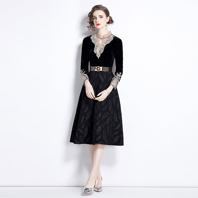 【ZiYanシリーズ】ワンピース ベルト付き レース ビロード Aライン 長袖 大きいサイズ ブラック M L XL 2XL