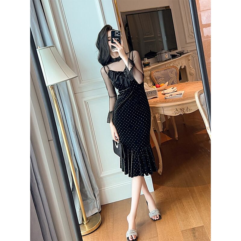 【夕暮薔薇シリーズ】ワンピース ビロード ドット柄 パーティー フィッシュテール 切り替え ブラック S M L XL