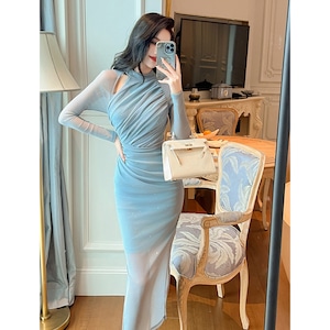 【夕暮薔薇シリーズ】ワンピース デザイン感 パーティー チュール素材 フォグブルー S M L XL