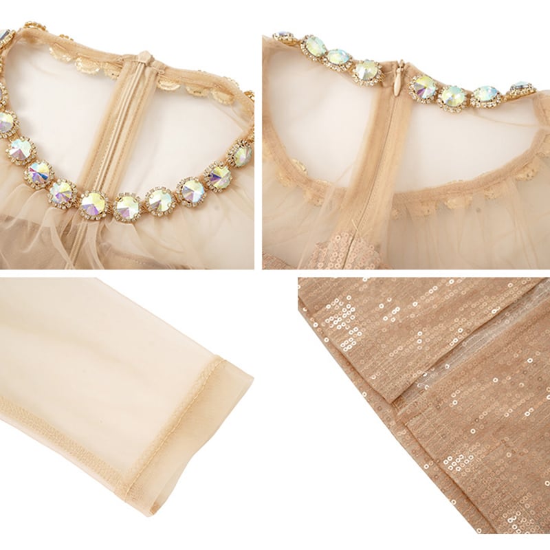 【夕暮薔薇シリーズ】ワンピース デザイン感 スパンコール パーティー チュール素材 ラインストーン 大きいサイズ ゴールド S M L XL 2XL