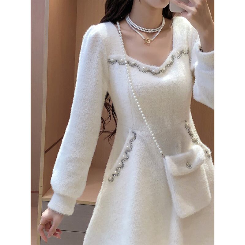 【Airi Styleシリーズ】ワンピース バッグ付き スクエアネック 秋冬 Aライン ラインストーン ニット ベージュ イエロー パープル ピンク
