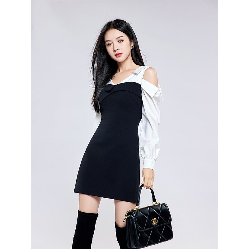 【Airi Styleシリーズ】ワンピース OL/通勤 切り替え Aライン 肩見せ 長袖 ブラック S M L